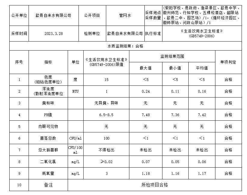 2023年3月下半月管網(wǎng)水水質(zhì)信息公告