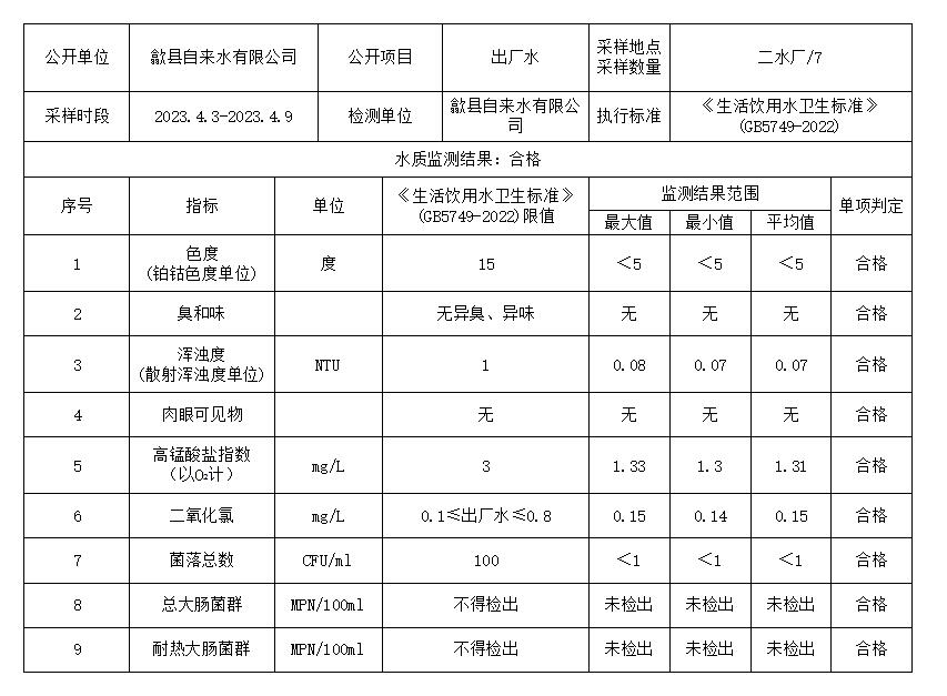 2023.4.3-2023.4.9出廠水質(zhì)信息公告