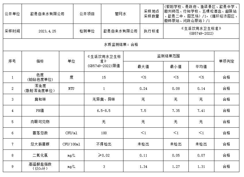 2023年4月下半月管網(wǎng)水水質(zhì)信息公告