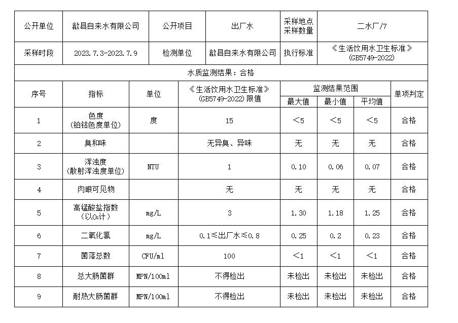 2023.7.3-2023.7.9出廠水質(zhì)信息公告