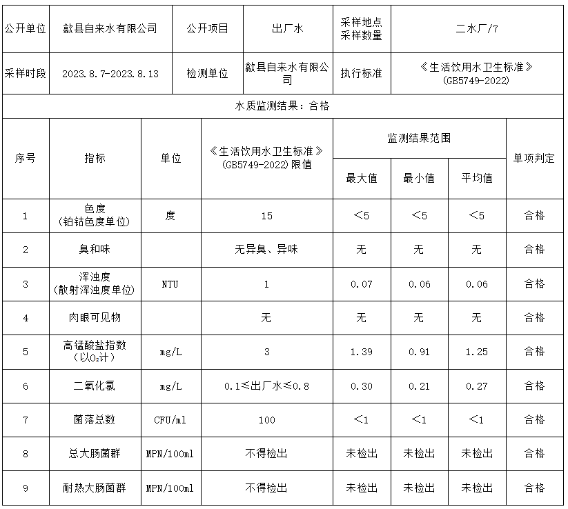 2023.8.7-2023.8.13出廠水質(zhì)信息公告