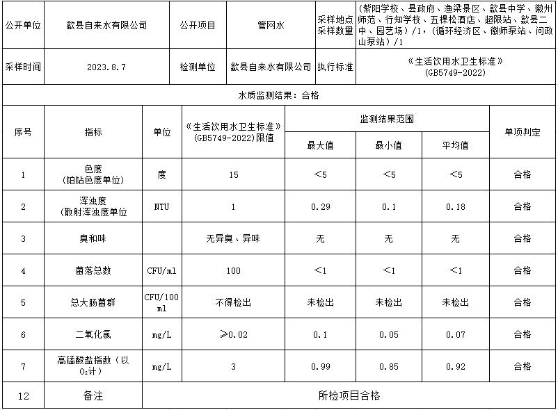 2023年8月下半月管網(wǎng)水水質(zhì)信息公告
