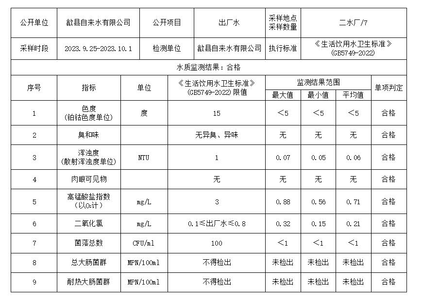 2023.9.25-2023.10.1出廠水質(zhì)信息