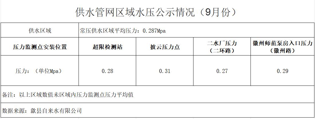 供水管網(wǎng)區(qū)域水壓公示情況(9月份)