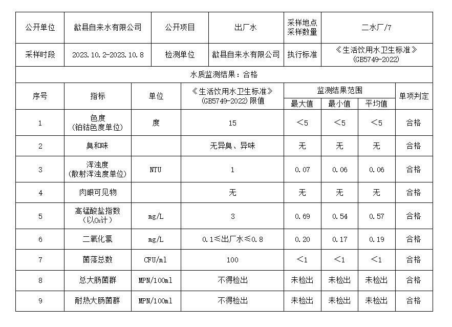 2023.10.2-2023.10.8出廠水質(zhì)信息公告