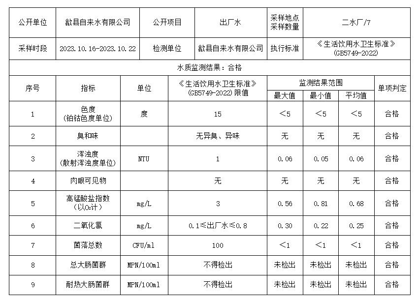 2023.10.16-2023.10.22出廠水質(zhì)信息公告
