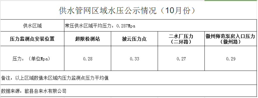 供水管網(wǎng)區(qū)域水壓公示情況(10月份)