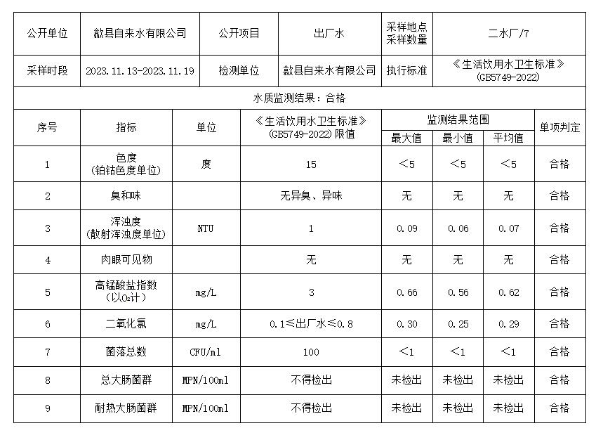 2023.11.13-2023.11.19出廠水質(zhì)信息公告