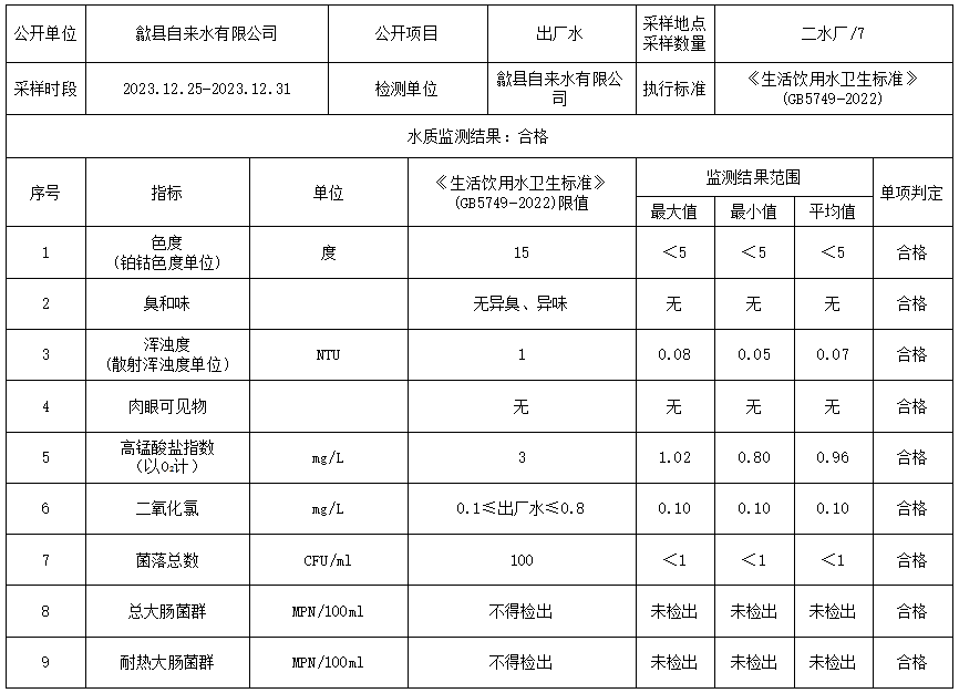 2023.12.25-2023.12.31出廠水質(zhì)信息公告