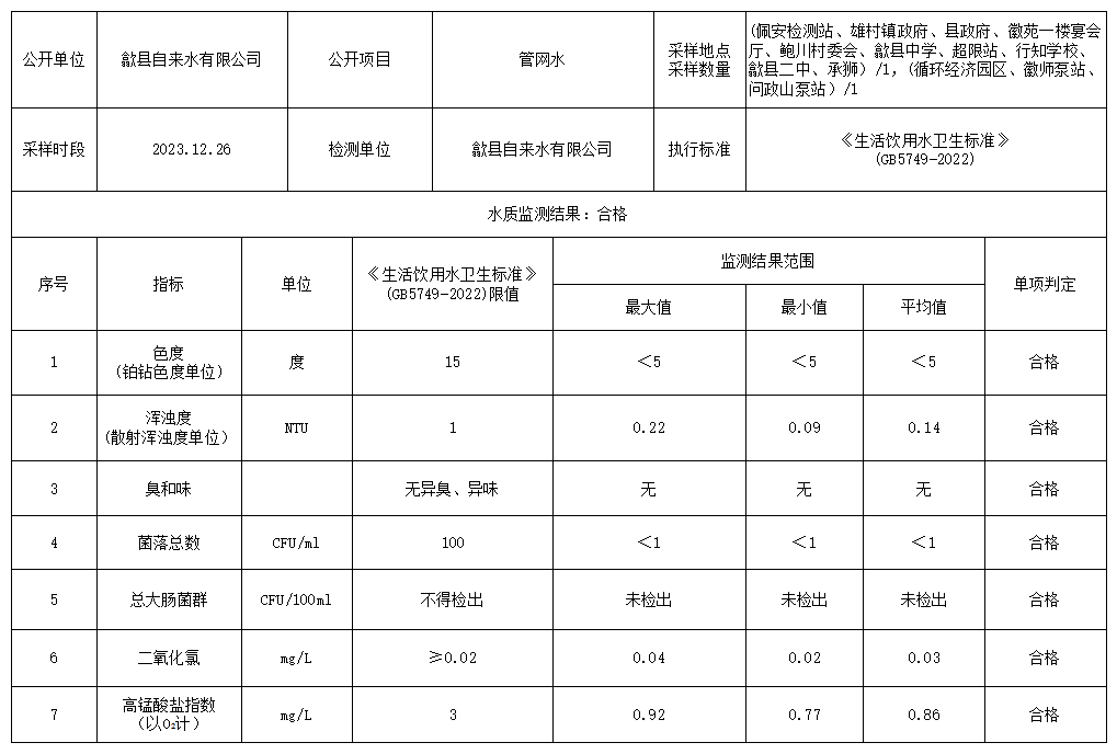 2023年12月下半月管網(wǎng)水水質(zhì)信息公告