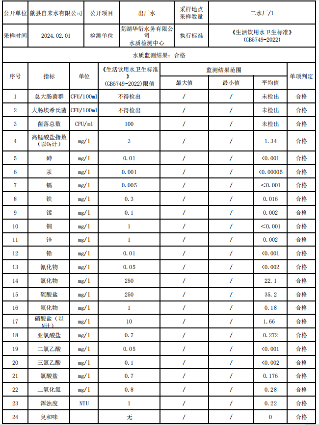 2024年2月出廠水水質(zhì)信息公告