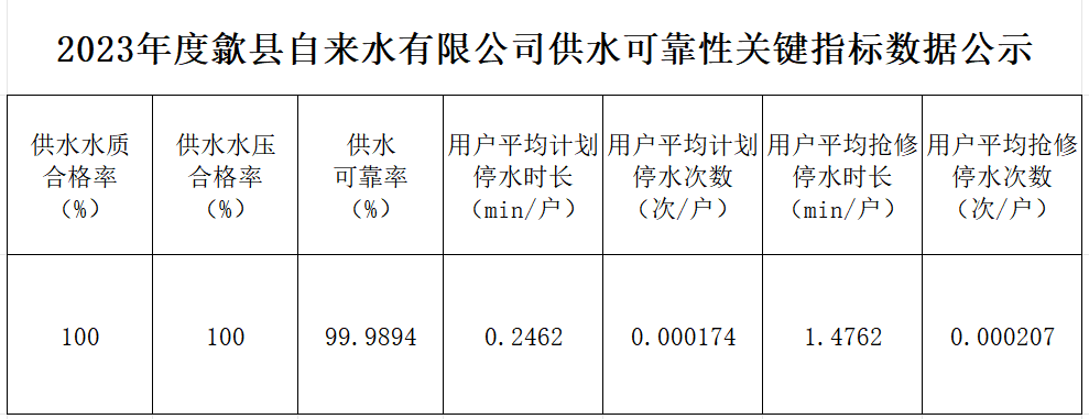 2023年度歙縣自來(lái)水有限公司供水可靠性關(guān)鍵指標(biāo)數(shù)據(jù)公示