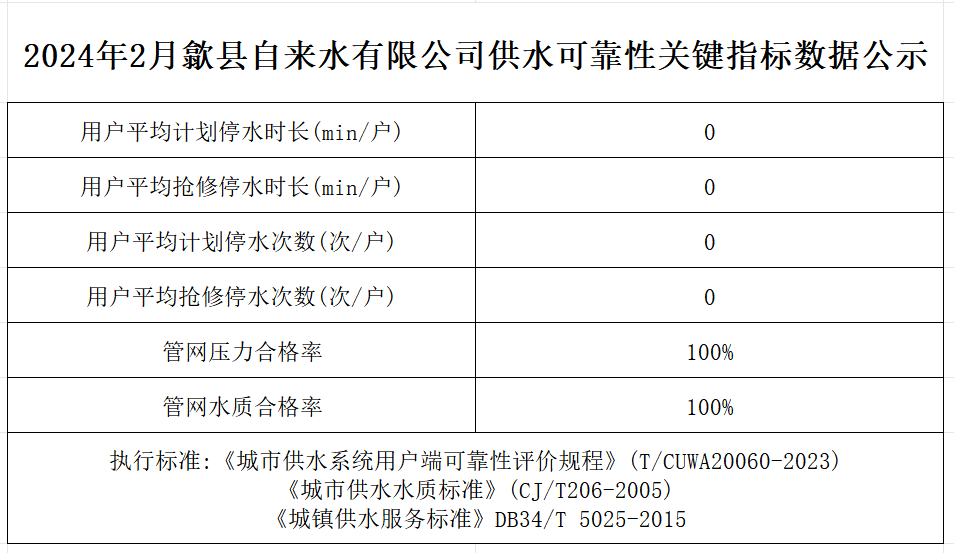 2024年2月歙縣自來水有限公司供水可靠性關(guān)鍵指標(biāo)數(shù)據(jù)公示