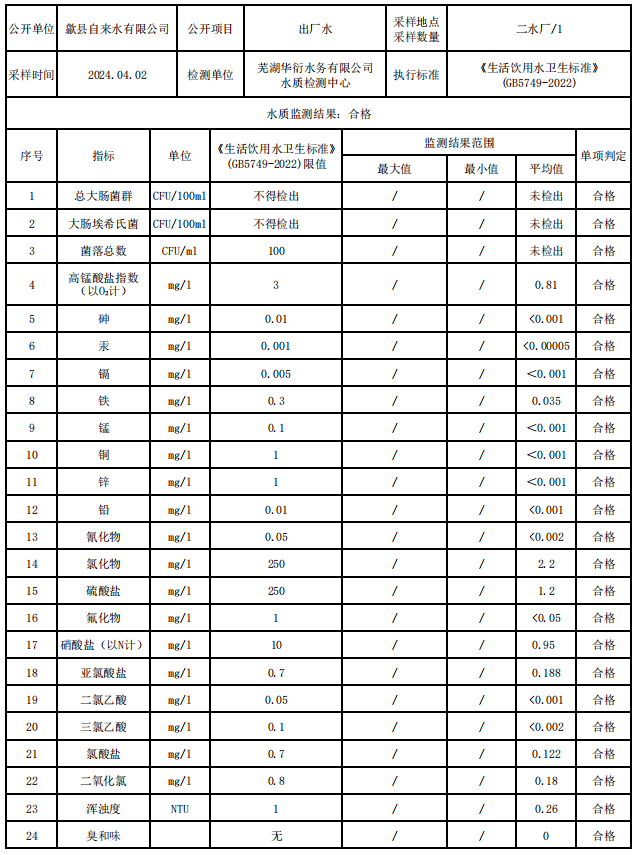 2024年4月出廠水水質(zhì)信息公告