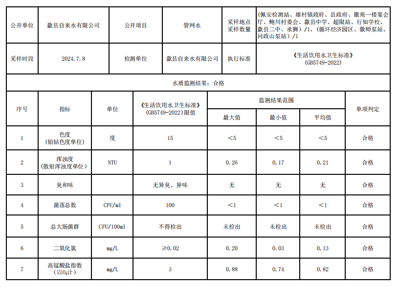 2024年7月下半月管網(wǎng)水水質(zhì)信息公告