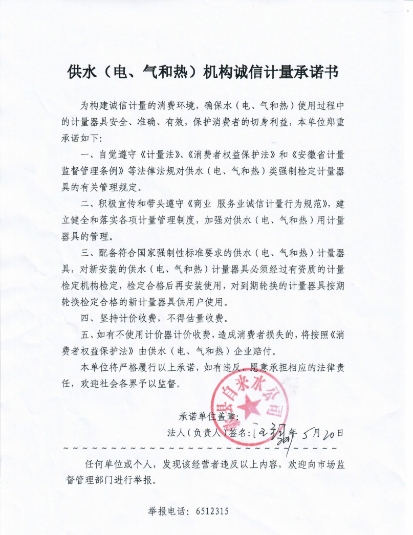 歙縣自來(lái)水有限公司誠(chéng)信計(jì)量承諾