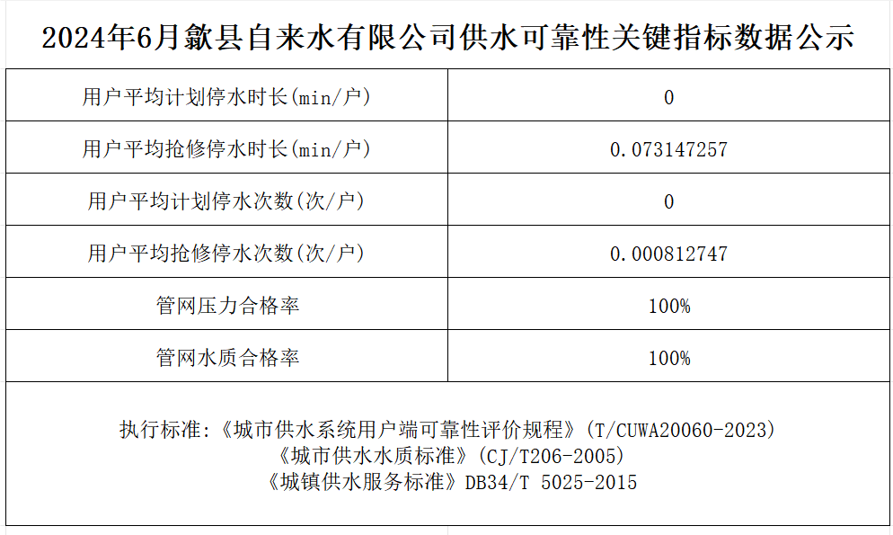 2024年6月歙縣自來水有限公司供水可靠性關(guān)鍵指標數(shù)據(jù)公示