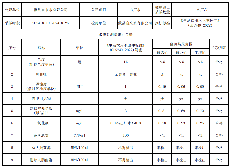 2024.8.19-2024.8.25出廠水質(zhì)信息公告