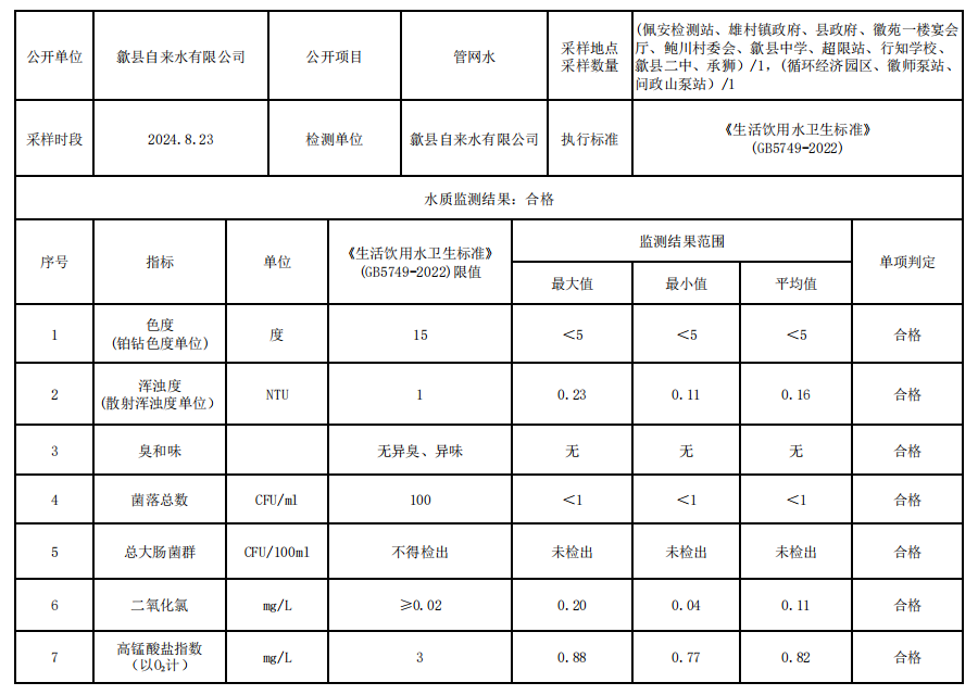 2024年8月下半月管網(wǎng)水水質(zhì)信息公告