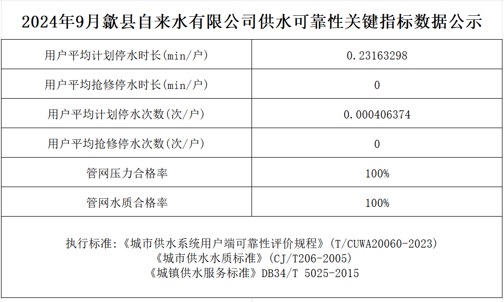 2024年9月歙縣自來水有限公司供水可靠性關(guān)鍵指標(biāo)數(shù)據(jù)公示