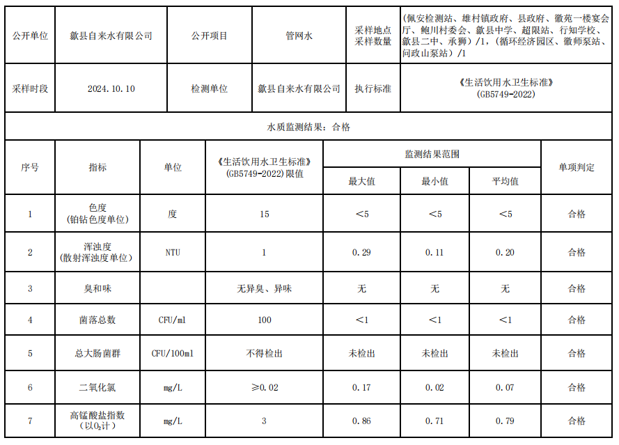 2024年10月下半月管網(wǎng)水水質(zhì)信息公告