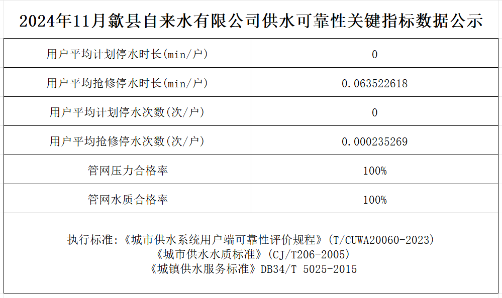 2024年11月歙縣自來水有限公司供水可靠性關(guān)鍵指標(biāo)數(shù)據(jù)公示