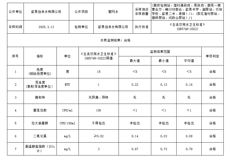 2025年3月下半月管網(wǎng)水水質(zhì)信息公告