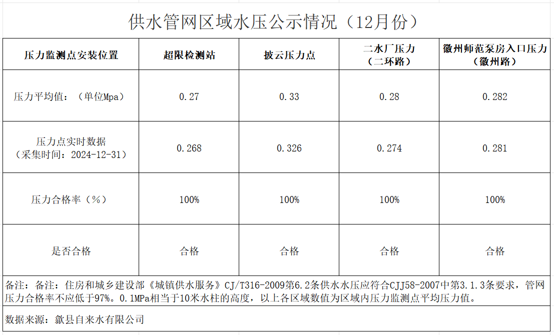 供水管網(wǎng)區(qū)域水壓公示情況(12月份)