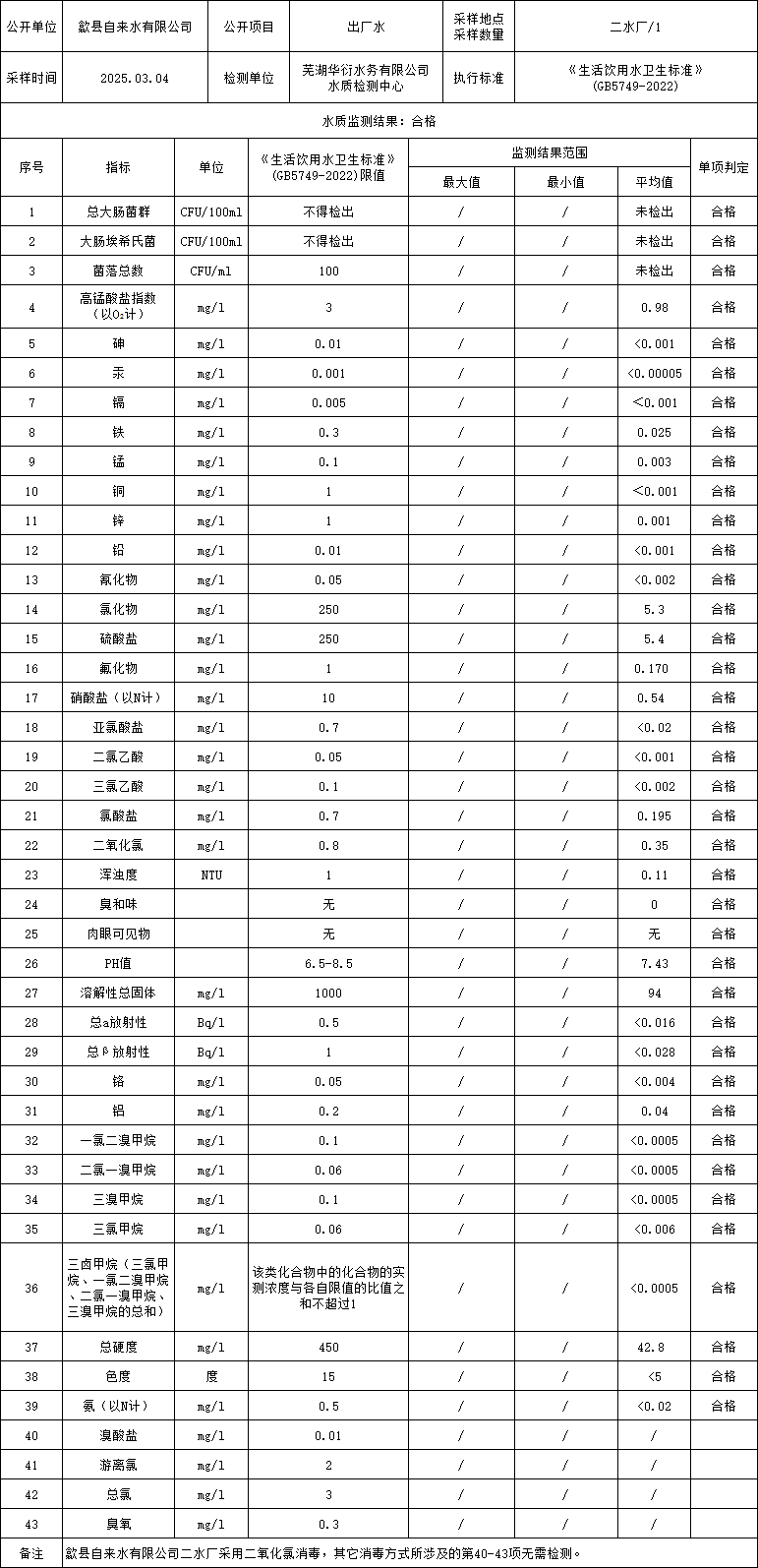 2025年3月出廠水水質(zhì)信息公告