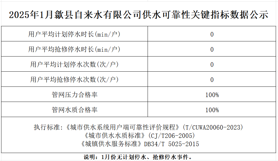2025年1月歙縣自來水有限公司供水可靠性關(guān)鍵指標(biāo)數(shù)據(jù)公示