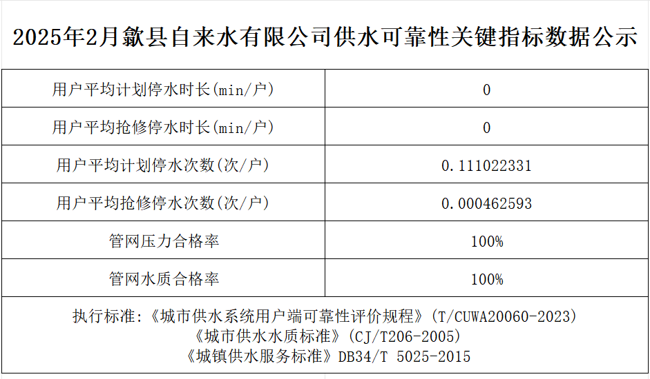 2025年2月歙縣自來水有限公司供水可靠性關(guān)鍵指標數(shù)據(jù)公示