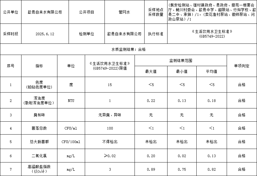 2025年6月下半月管網(wǎng)水水質(zhì)信息公告