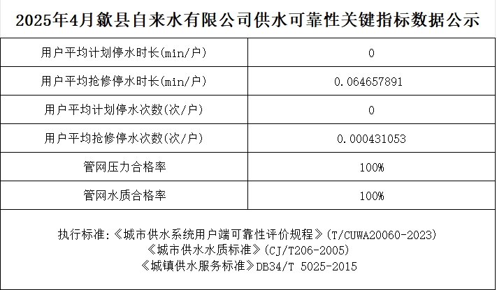 2025年4月歙縣自來水有限公司供水可靠性關(guān)鍵指標數(shù)據(jù)公示