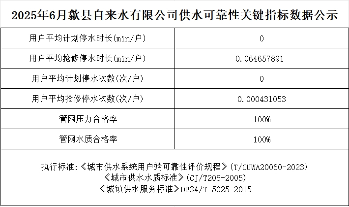 2025年6月歙縣自來水有限公司供水可靠性關(guān)鍵指標(biāo)數(shù)據(jù)公示