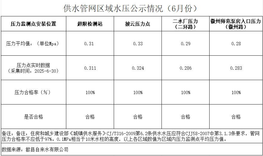 供水管網(wǎng)區(qū)域水壓公示情況(2025年6月份)