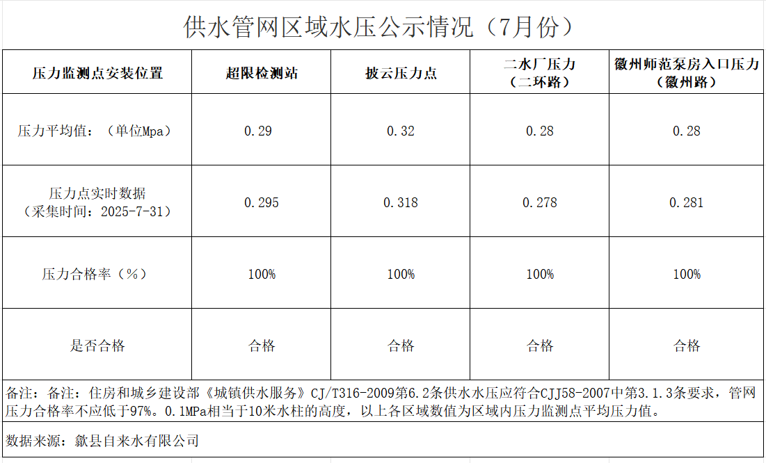 供水管網(wǎng)區(qū)域水壓公示情況(2025年7月份)