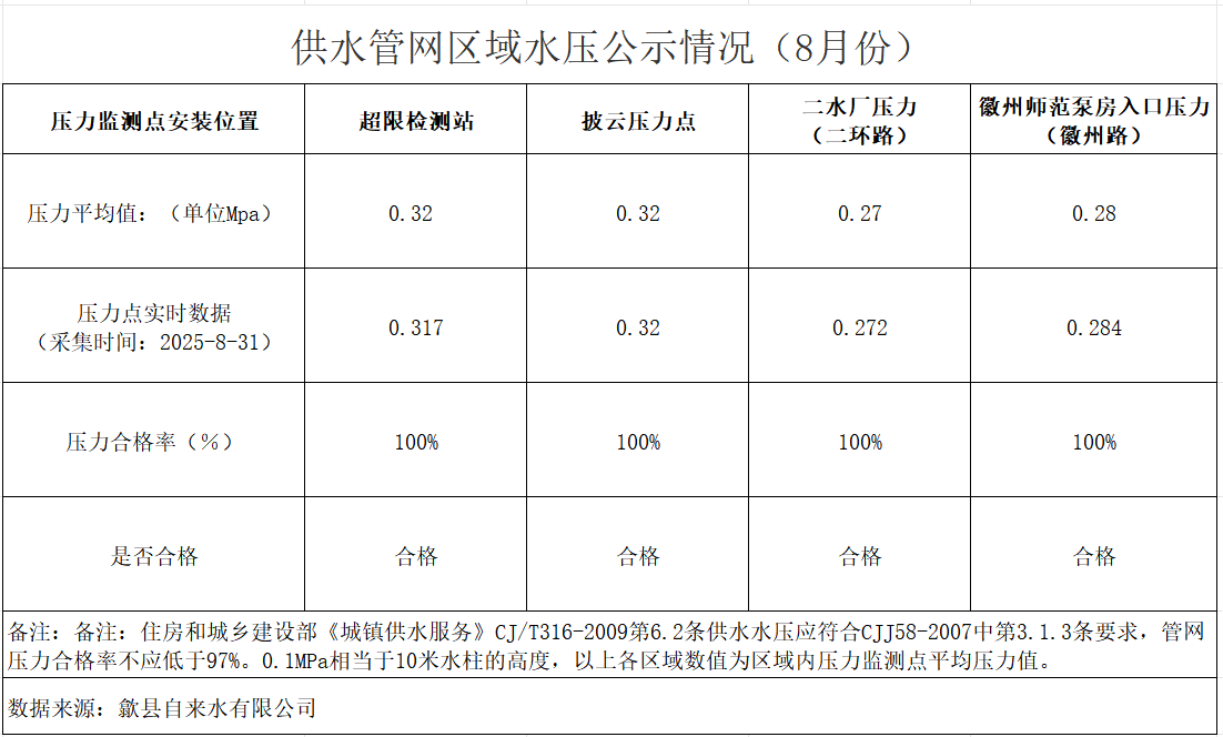 供水管網(wǎng)區(qū)域水壓公示情況(2025年8月份)