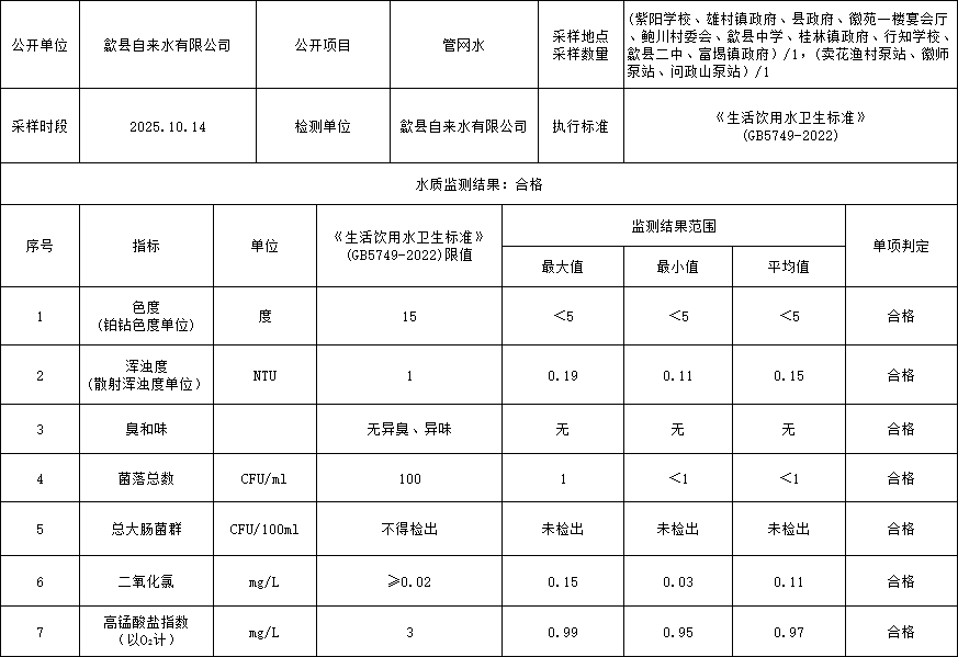2025年10月上半月管網(wǎng)水水質(zhì)信息公告