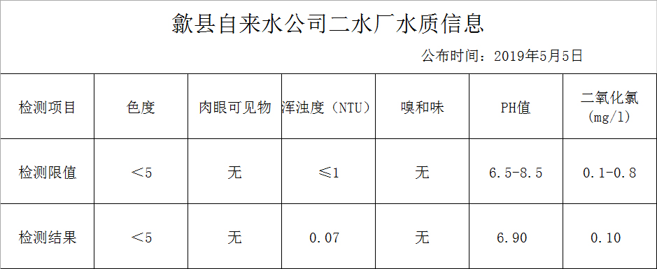 歙縣自來水有限公司2019年4月管網(wǎng)末梢水質(zhì)信息