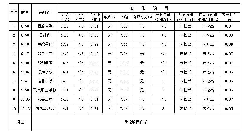 歙縣自來水有限公司2019年4月管網(wǎng)末梢水質(zhì)信息