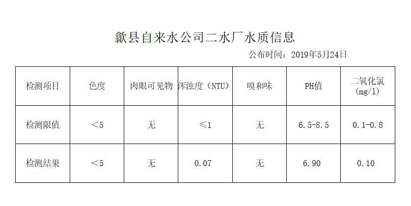 歙縣自來水有限公司2019年5月管網末梢水質信息