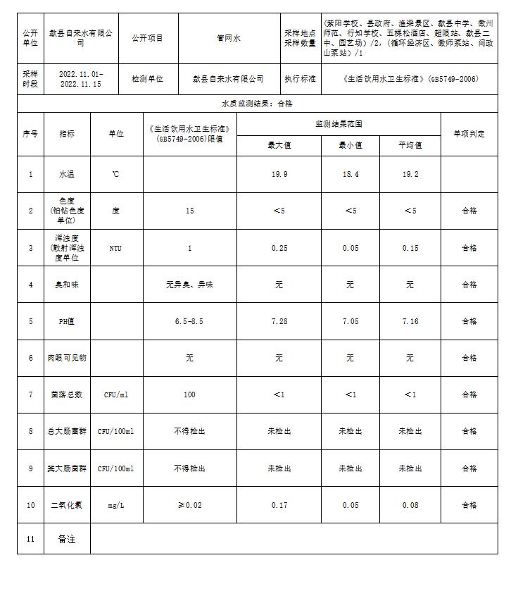 2022年11月下半月管網水水質信息