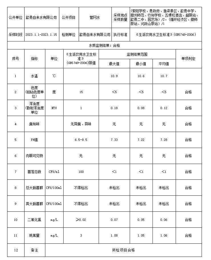 2023年1月上半月管網(wǎng)水水質(zhì)信息公告