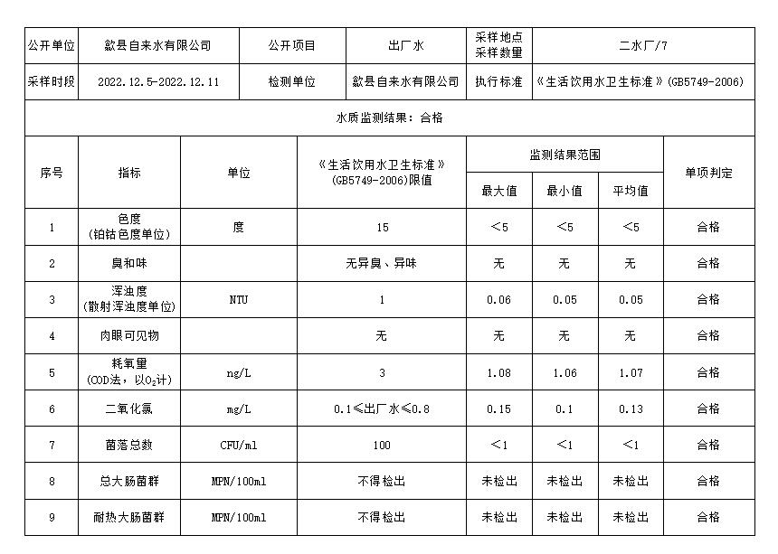 2022.12.5-2022.12.11出廠水質(zhì)信息公告