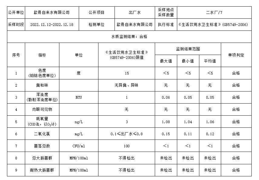 2022.12.12-2022.12.18出廠水質(zhì)信息公告