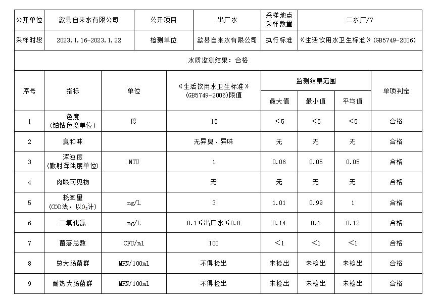 2023.1.16-2023.1.22出廠水質(zhì)信息公告