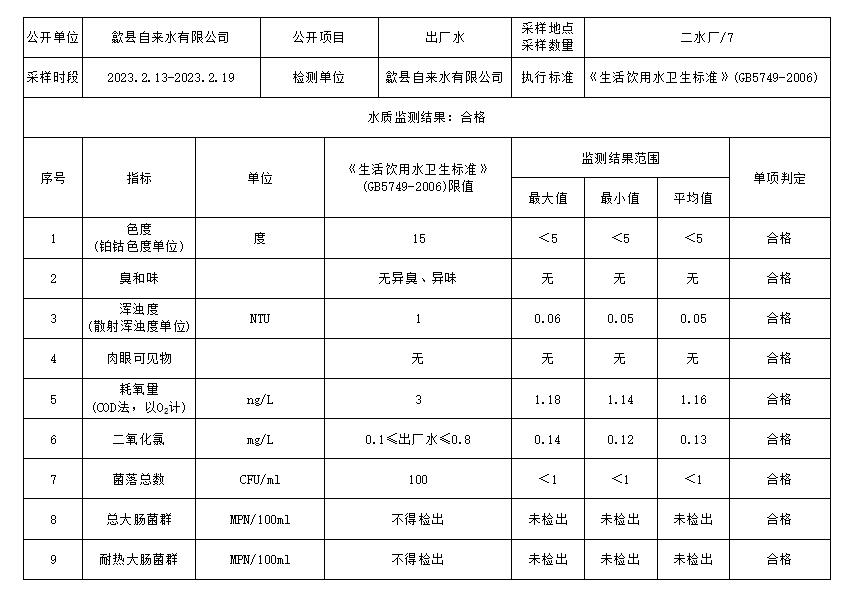 2023.2.13-2023.2.19出廠水質(zhì)信息公告