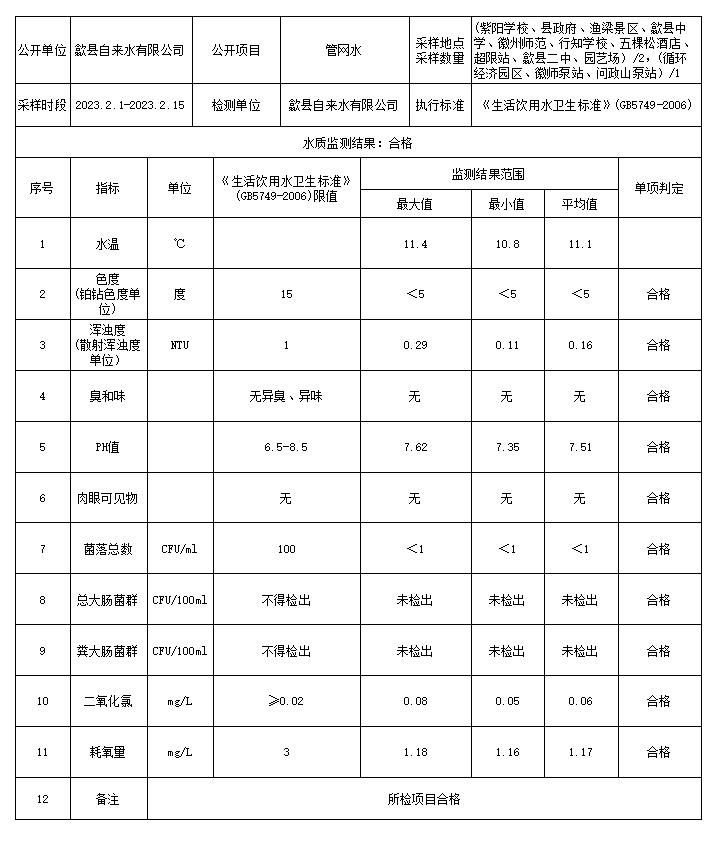 2023年2月下半月管網(wǎng)水水質(zhì)信息公告